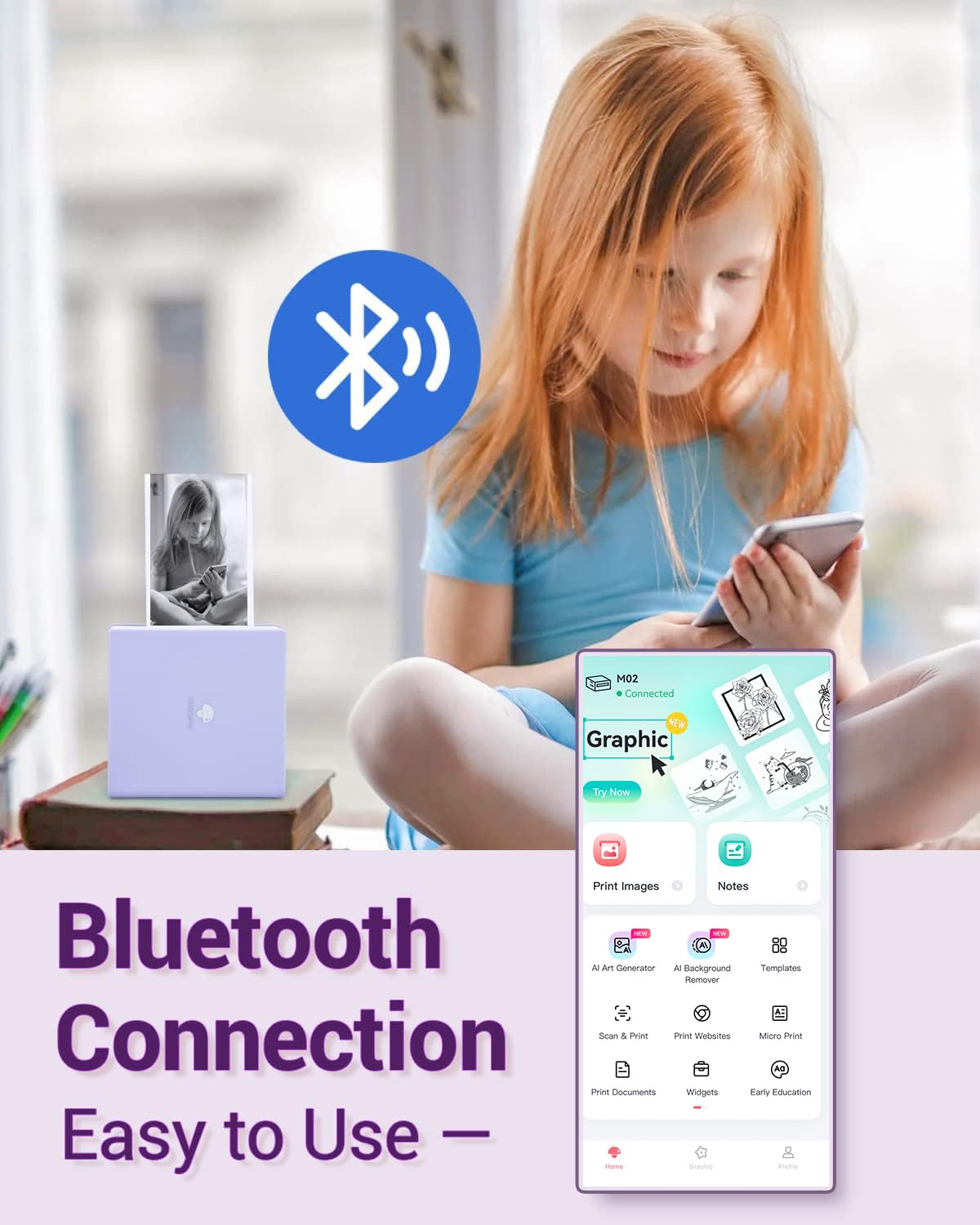 Phomemo M02 is a wireless mini printer designed for students and bullet journal enthusiasts. Its compact size makes it easy to take anywhere. With the mobile app, you can create personalized stickers, print your photos, and even generate AI images with just a few taps.