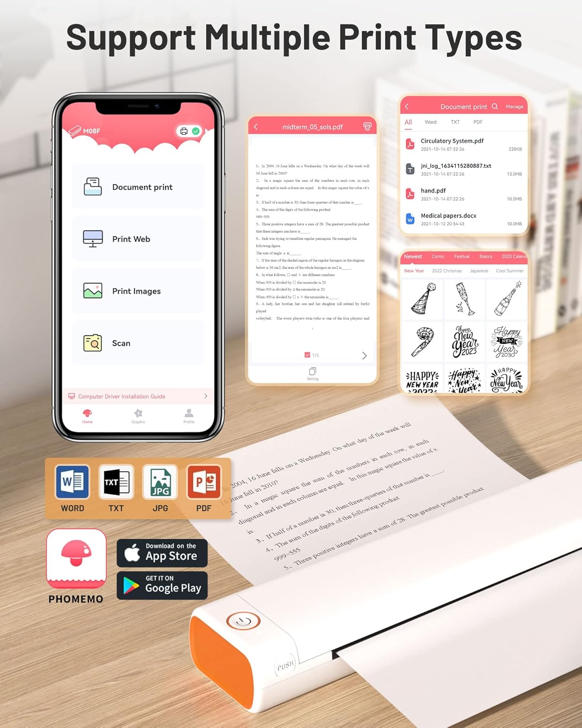 Phomemo M08F Portable Wireless Printer for Travel Mini Home Printer - White, Standard Printer